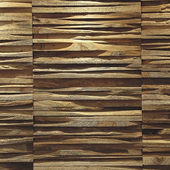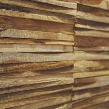 L'ondulatoria irregolarità delle pareti rivestite in legno Teak NEMESI trasmette all'ambiente circostante un'armonia perfetta, nella quale immergersi ogni giorno.