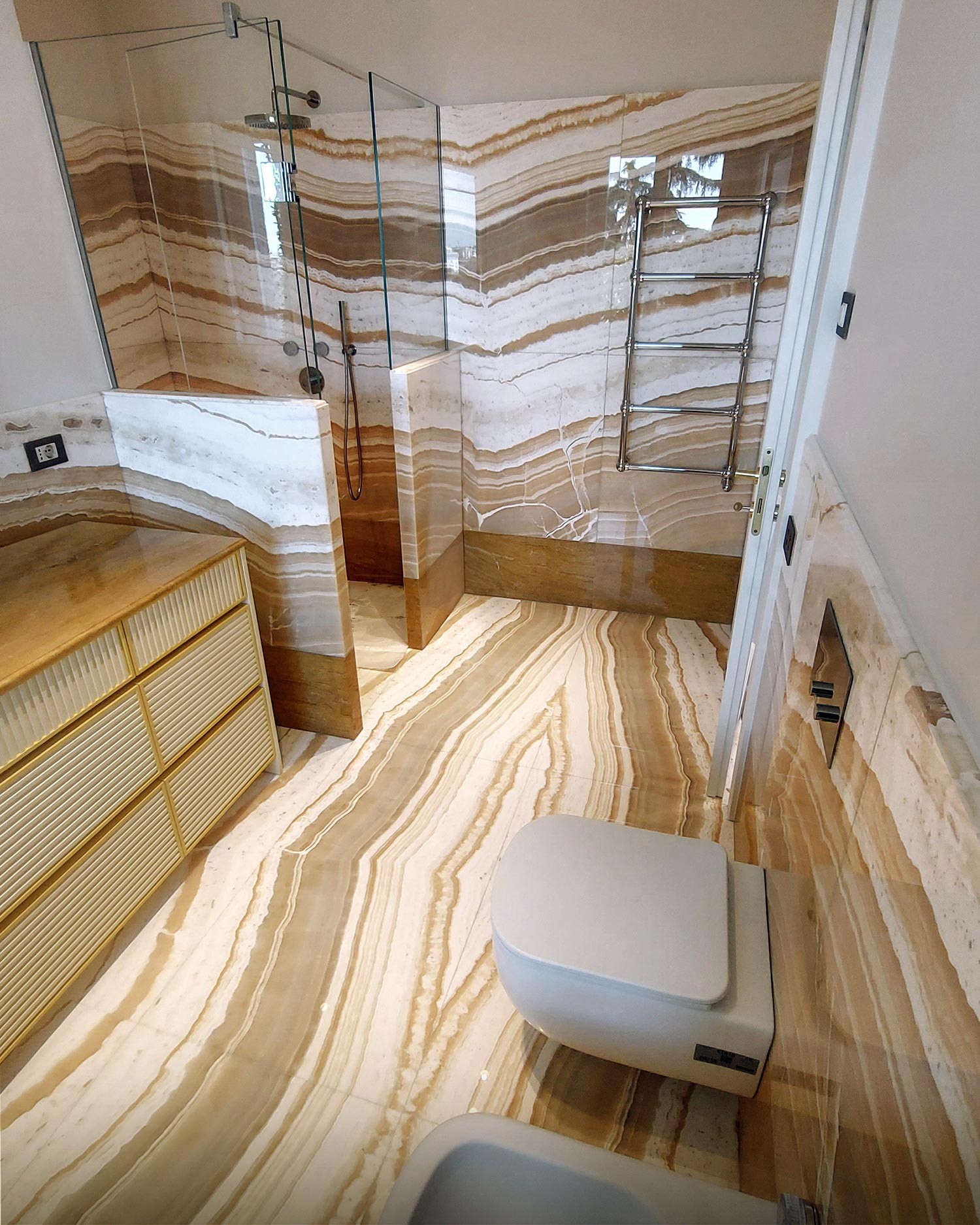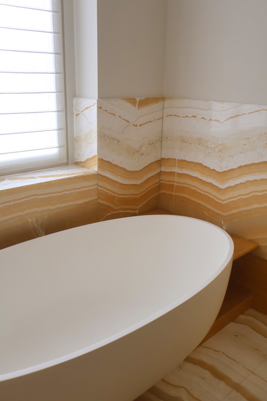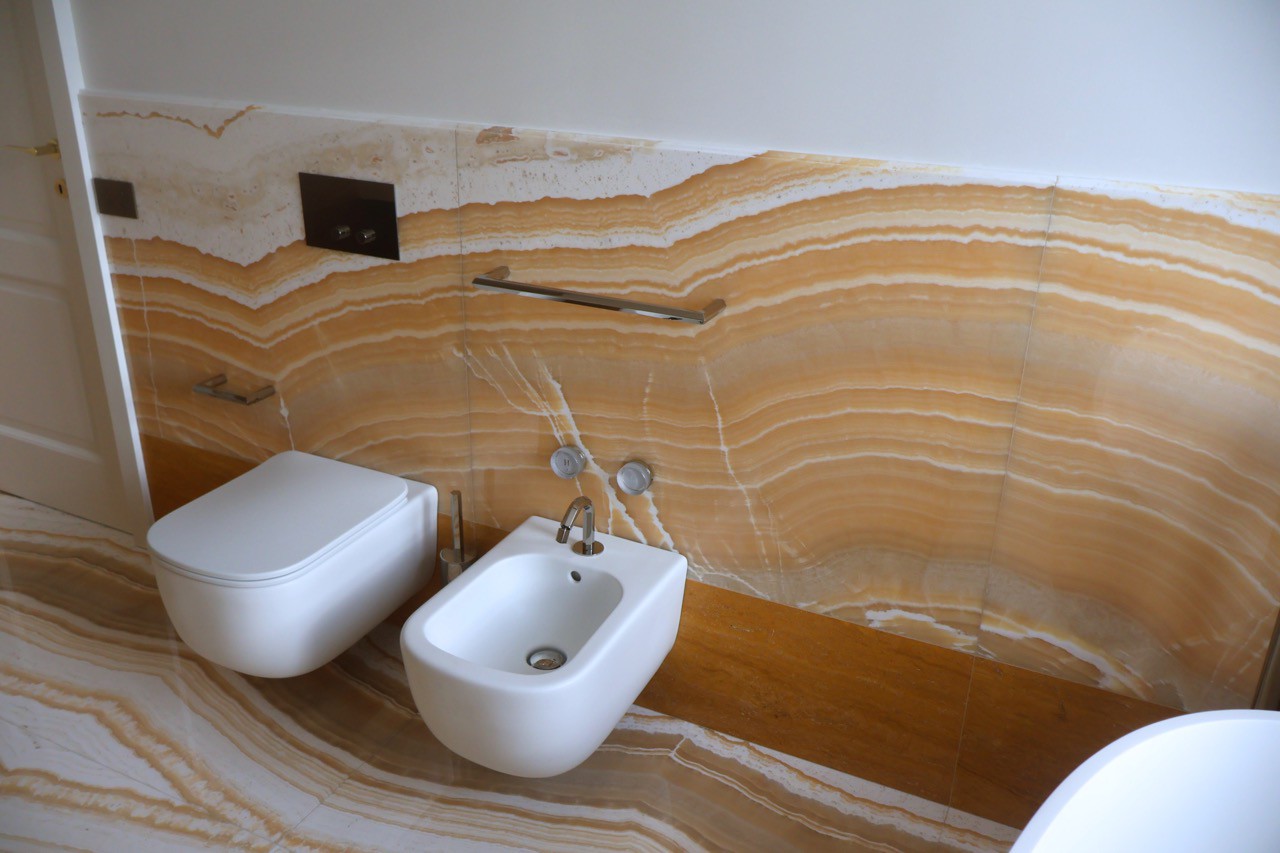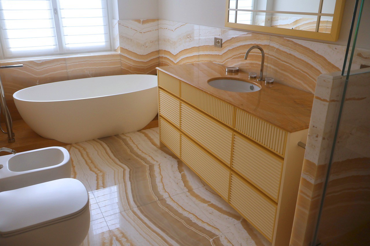 In questo progetto di interior design, il bagno si trasforma in un luogo intimo e raffinato, dove la pietra naturale è protagonista in una delle sue forme più scenografiche: l’onice miele lavorata a macchia aperta. Una scelta estetica potente, capace di dare all’ambiente un’identità visiva forte e al tempo stesso sofisticata.
