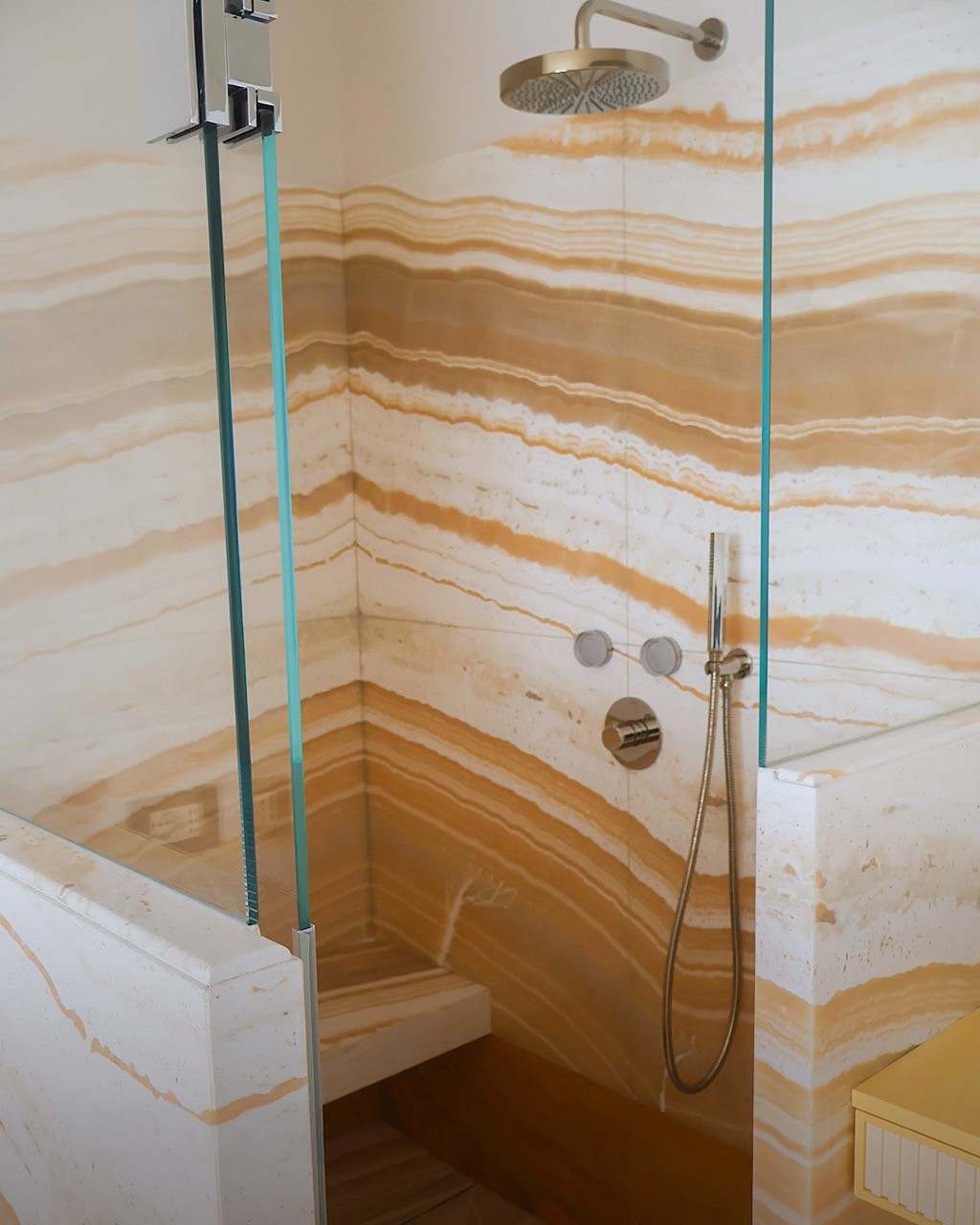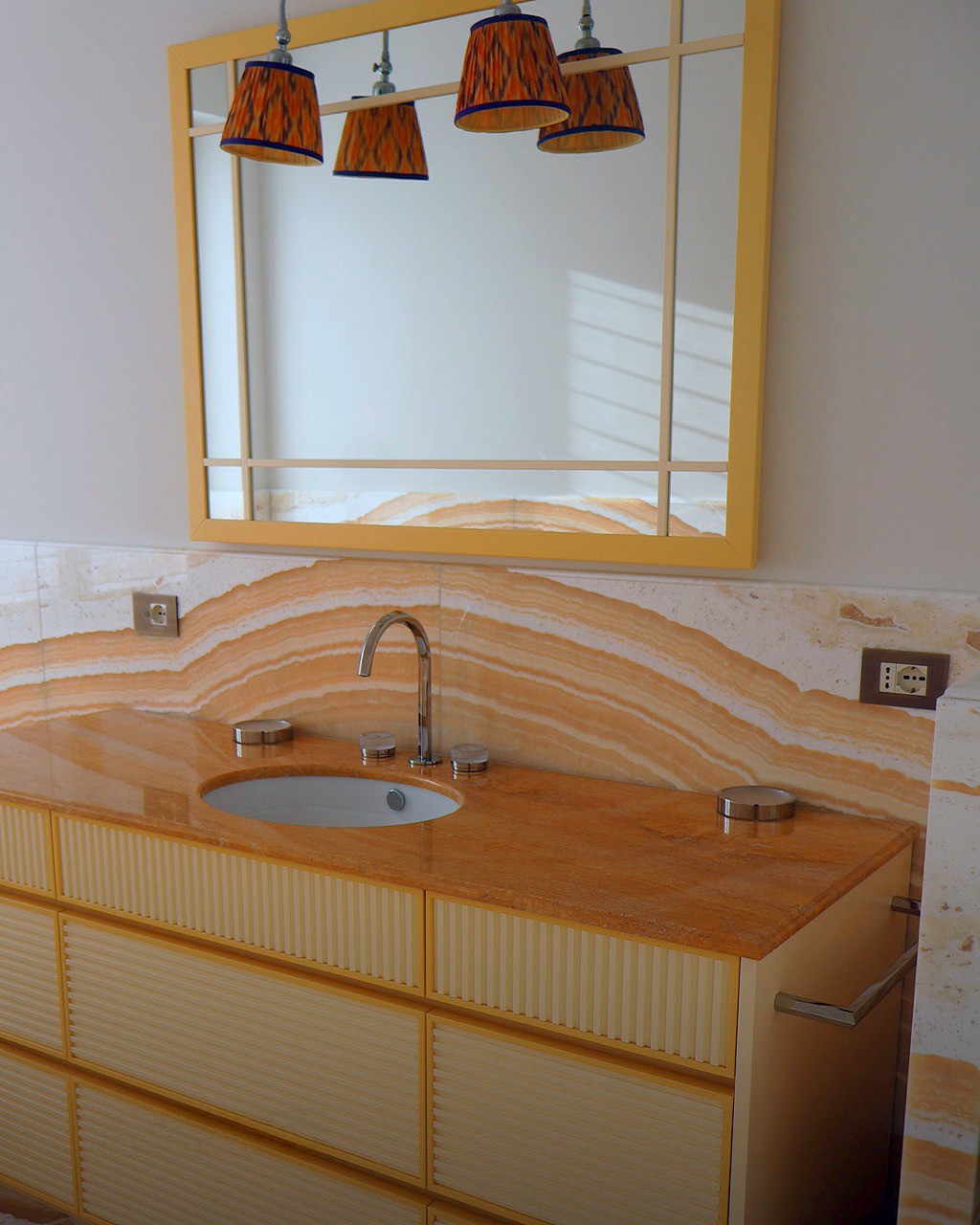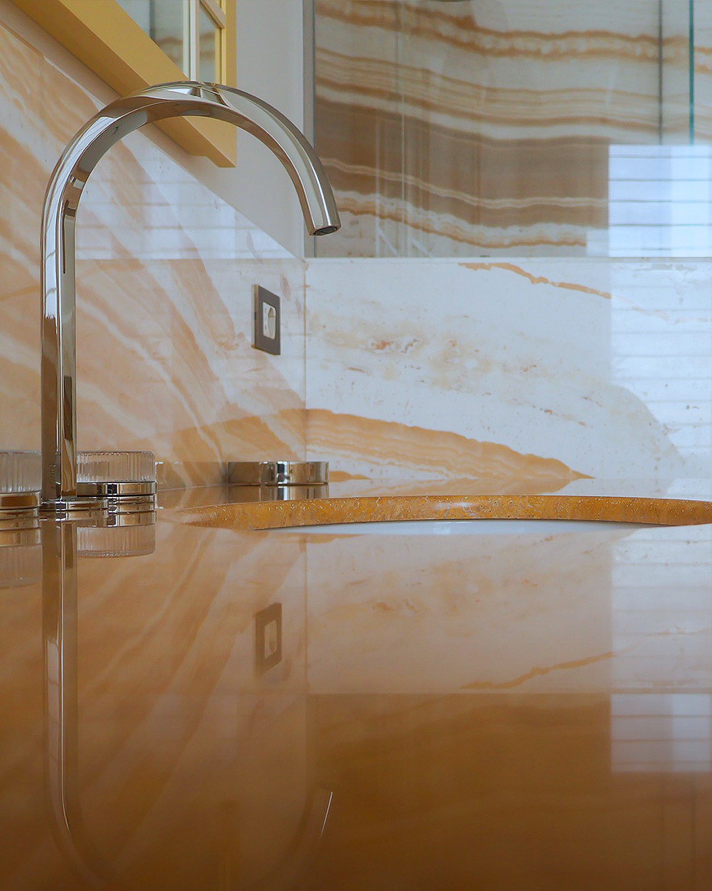 In questo progetto di interior design, il bagno si trasforma in un luogo intimo e raffinato, dove la pietra naturale è protagonista in una delle sue forme più scenografiche: l’onice miele lavorata a macchia aperta. Una scelta estetica potente, capace di dare all’ambiente un’identità visiva forte e al tempo stesso sofisticata.