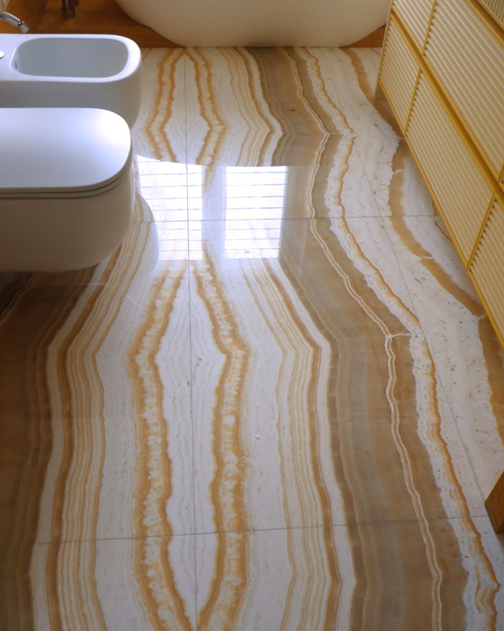 Nel caso dell’onice miele, la texture calda e vibrante si amplifica grazie a questa posa, generando superfici che sembrano vive, in movimento, in dialogo costante con la luce.
