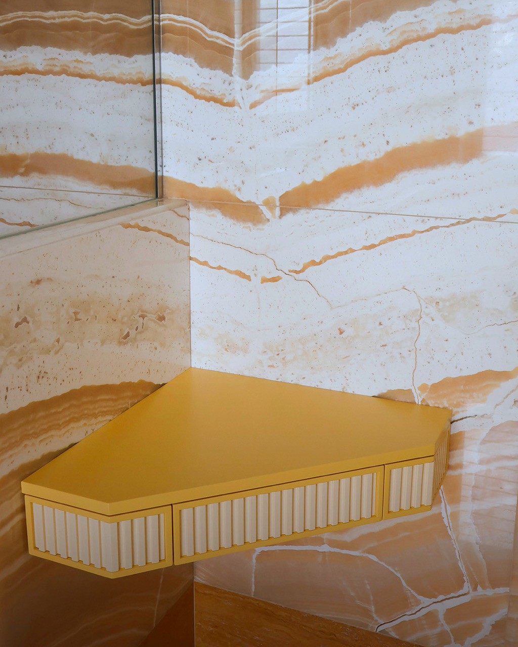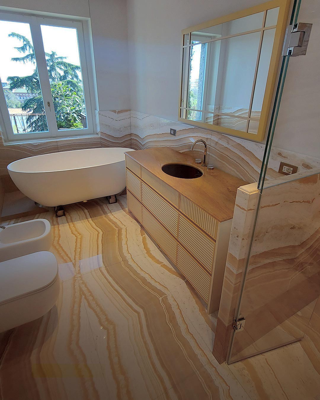 Geometrie di luce e pietra: il fascino dell'onice miele in un bagno dal carattere unico