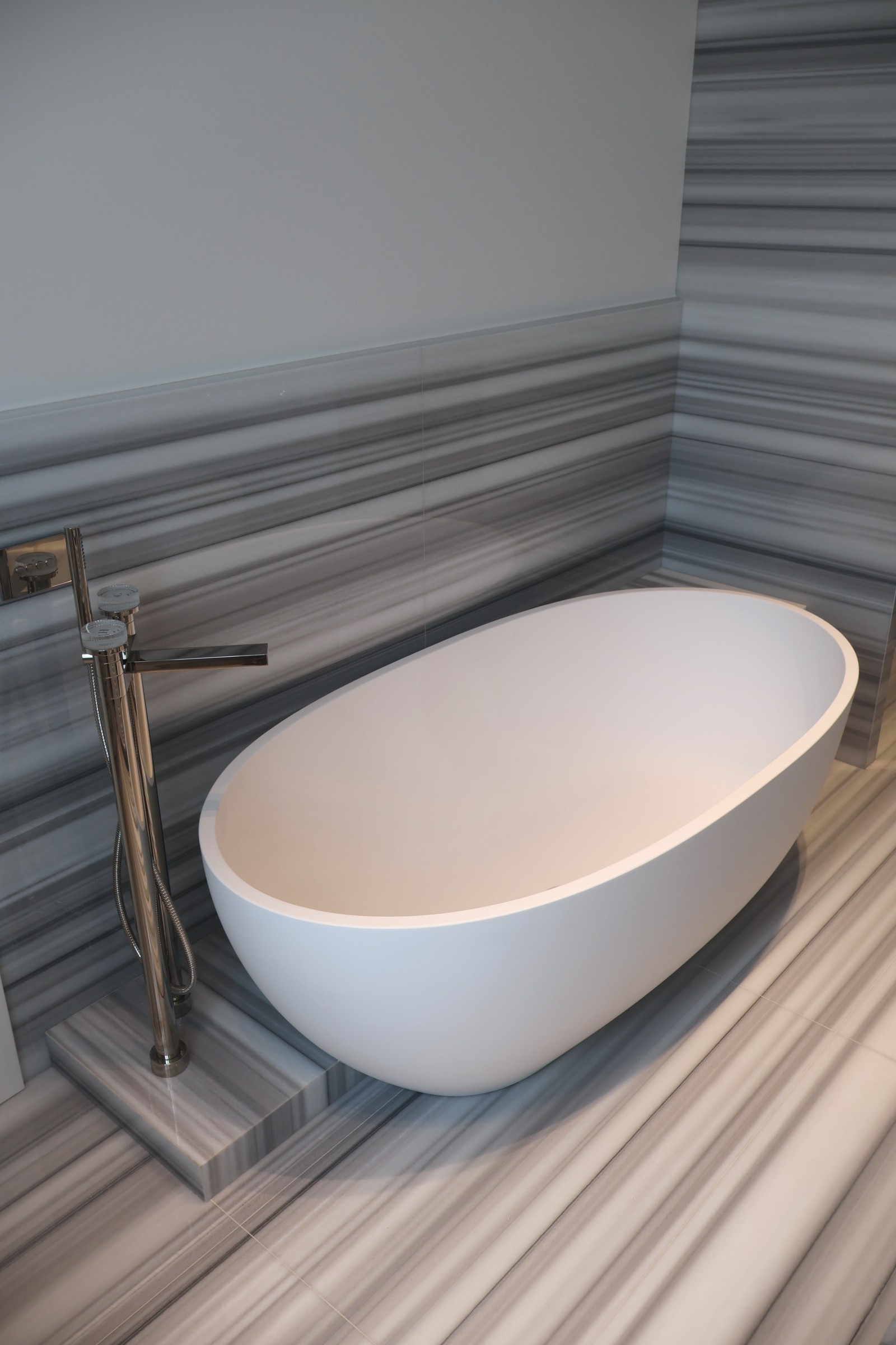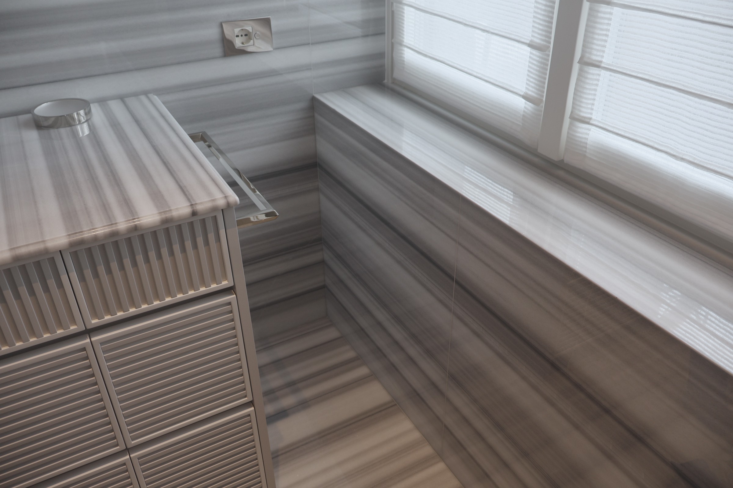 La scelta del materiale è ricaduta sul marmo Striato Olimpo, una pietra naturale di origine turca che si distingue per il suo fondo bianco puro, attraversato da venature grigie sottili e regolari, disposte in modo parallelo.